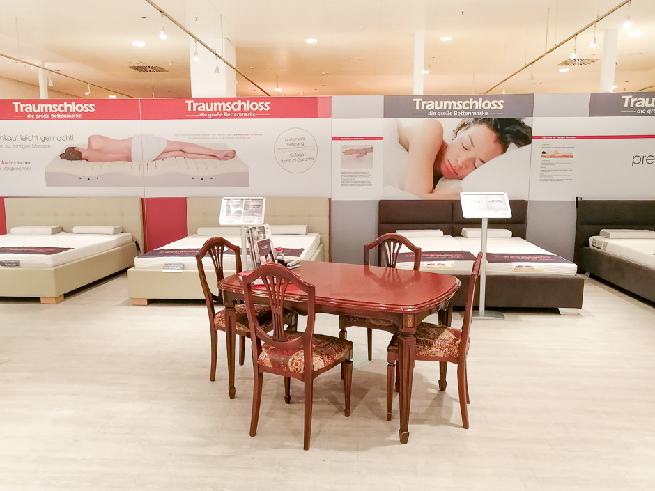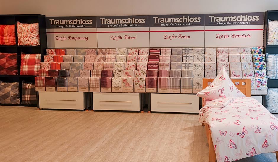 In der Filiale im Ruhrpark finden Sie auf großzügigen 450 qm das gesamte Sortiment von Gebers ... die Schlafexperten. Frottierwaren und Heimtextilien werden Ihnen hier genauso angeboten, wie die gesamte Palette der Traumschloss-Produkte. Ob Sie auf der Suche nach einer neuen Thermo-Bettdecke sind, sich für Federkissen interessieren, ob Sie eine Matratzenauflage aus Molton haben möchten oder sich in einen neuen Bettbezug aus der Traumschloss-Kollektion verliebt haben – unsere 8 bestens geschulten Mitarbeiter*innen zeigen Ihnen gern alles, was Sie wünschen. Zusätzlich bieten Ihnen unsere Gebers-Schlafexperten die Möglichkeit einer ausführlichen Liegeprobe mit anschließender Analyse an, damit Sie genau die Traumschloss-Matratze bekommen, die für Sie persönlich am besten passt. Um das neue Schlafvergnügen zu vervollständigen, finden Sie bei Gebers natürlich auch gleich den passenden Lattenrost, Laken und weiteres Bettenzubehör, wie beispielsweise Nackenrollen oder Unterbetten. Vertrauen Sie unserer Wohlfühlgarantie – denn Gebers ... die Schlafexperten wissen, was Sie für einen guten Schlaf brauchen.
