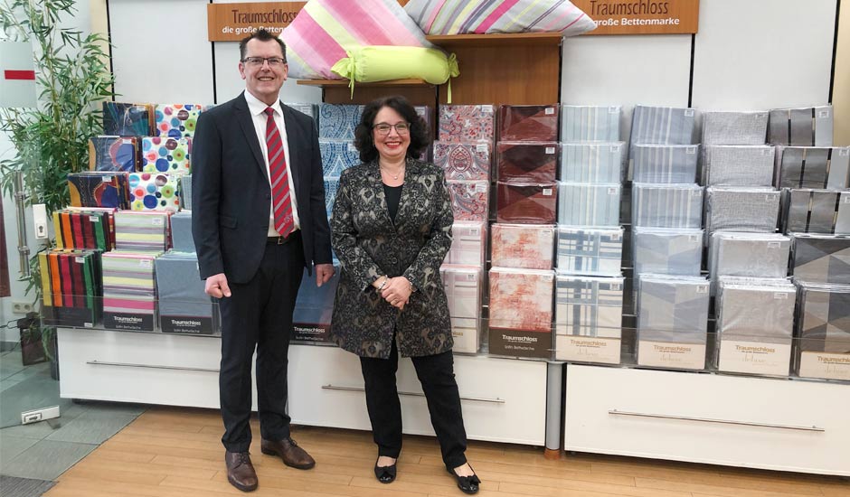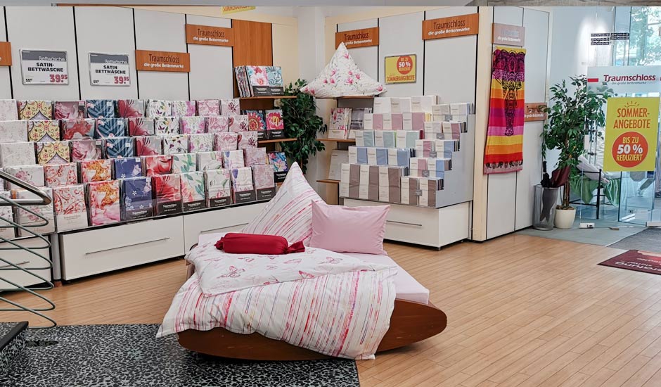 Auf zwei Etagen werden Ihnen von unseren vier Gebers-Mitarbeiter*innen die Markenprodukte des Traumschloss-Sortiments präsentiert. Im Erdgeschoss finden Sie auf 240 qm alle Bettdecken und Kopfkissen sowie die passenden Traumschloss-Bettbezüge und -Laken. Im ebenfalls 240 qm großen Matratzenstudio im ersten Obergeschoss können Sie zusätzlich im Heimtextilien-Sortiment stöbern. Nachdem Sie in vier Schritten zu Ihrer perfekten Traumschloss-Matratze gefunden haben, lohnt sich ein Blick auf die gut sortierten kuscheligen Wohndecken. Und ob Sie sich für eine Daunen- oder Faserdecke entscheiden, ein Classic-, Comfort-, Exclusiv- oder Premium-Kopfkissen bevorzugen: Bei einer Kuschelprobe im Erdgeschoss, bei der Sie alle Traumschloss-Produkte auf Herz- und Nieren prüfen können, helfen Ihnen die Gebers-Schlafexperten gerne bei der Entscheidung.