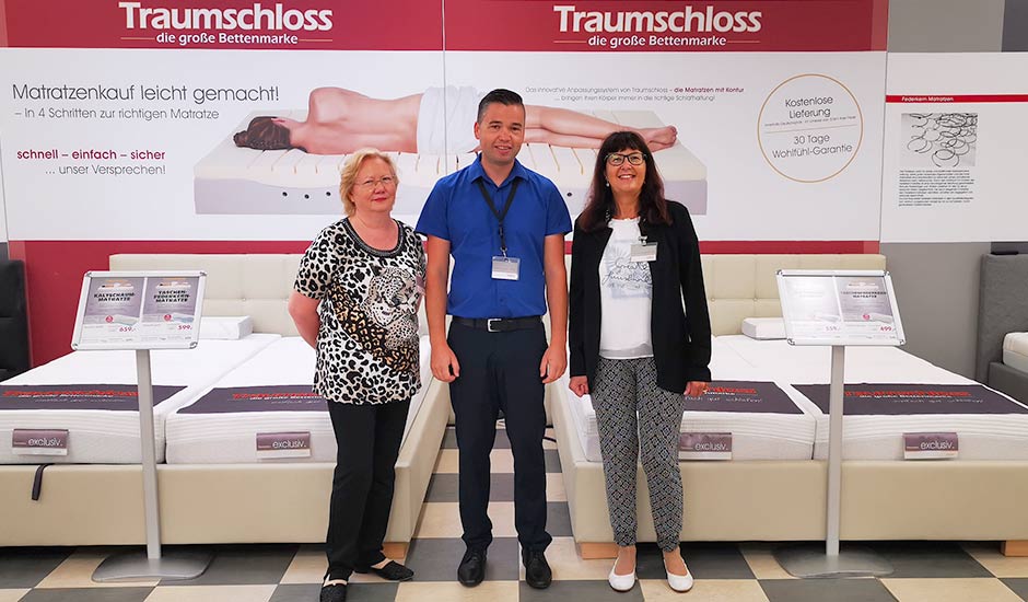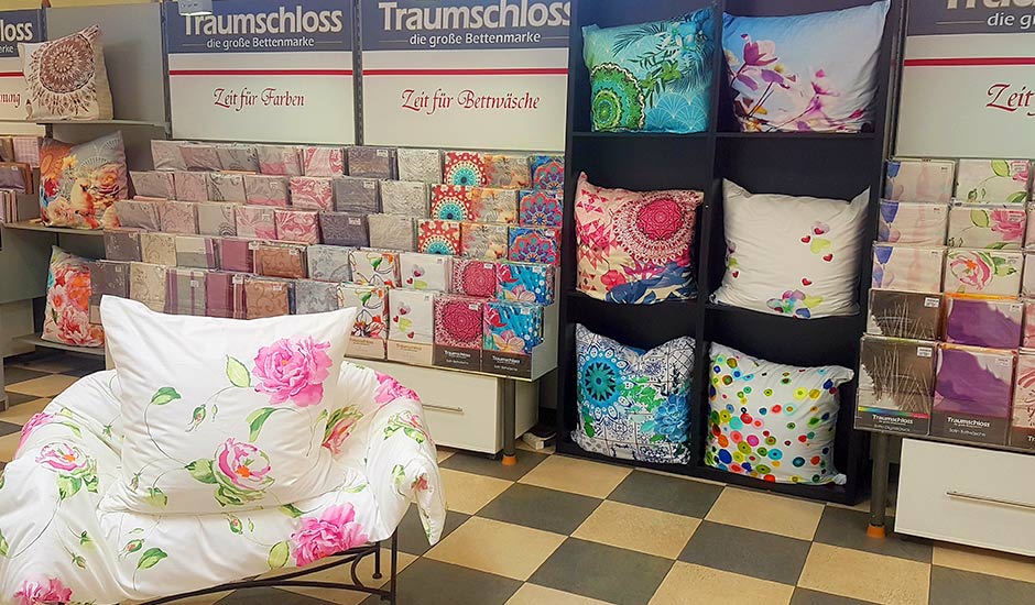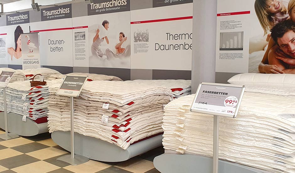 Auf der großzügigen 550 qm großen Ladenfläche im Erdgeschoss sind Sie bei der Suche nach einer neuen Matratze bei Gebers … die Schlafexperten in Friedrichshafen genau richtig. Bei uns finden Sie mithilfe der exzellenten Fachberatung unserer fünf Mitarbeiter*innen Ihr passendes Schlafsystem: verstellbare Lattenroste und eine Riesenauswahl an Federkern- oder Kaltschaummatratzen, und das in verschiedenen Ausführungen. Bei uns finden Sie für jeden Schlaftyp und jeden Geldbeutel die passende Ausstattung aus unserem Traumschloss-Sortiment für Ihr Bett, denn schließlich verbringen wir gut ein Drittel unseres Lebens im Bett. Und wer gut schläft, der ist gesünder und leistungsfähiger. Neben der individuellen Matratze sind auch Kissen und Bettwaren wichtig für Ihr Wohlbefinden. Von der superleichten Sommerdecke bis zur wärmenden Winterdecke können Sie unsere Traumschloss-Produkte ganz entspannt aussuchen. Die passenden Wohlfühl-Bett- und -Kissenbezüge gibt es in farblich gut sortierten Qualitäten gleich dazu.
