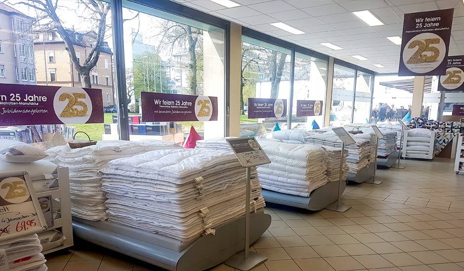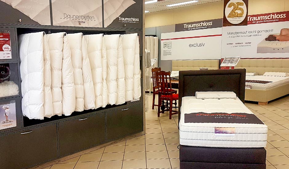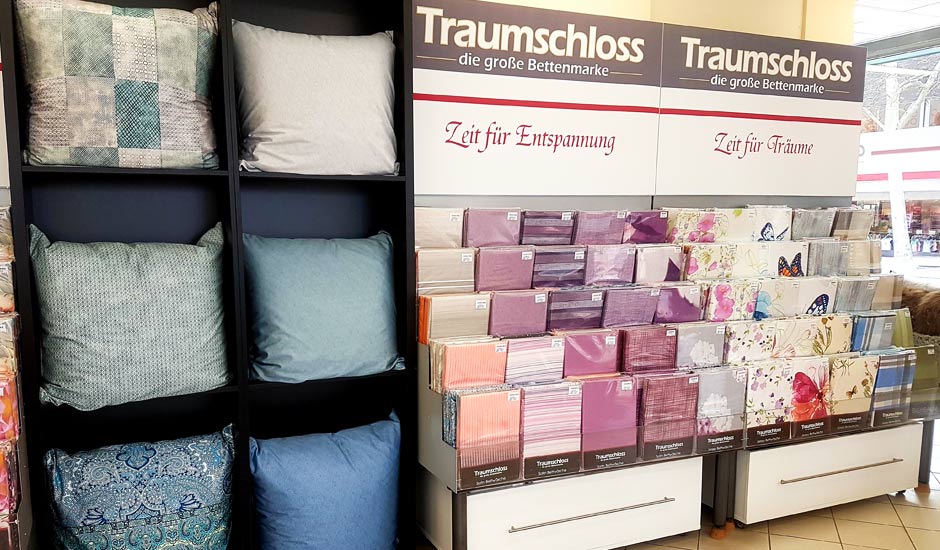 In Schweinfurt werden Sie von unseren fünf Gebers-Mitarbeiter*innen kompetent und freundlich beraten. Hier, am Rande der Altstadt von Schweinfurt, finden Sie die besten Produkte für einen gesunden Schlaf – und das schon seit 1986. Mit unserer Marke Traumschloss garantieren wir die höchste Qualität für jeden Anspruch – und die können Sie in unserem Geschäft auch gleich ausprobieren. Testen Sie unsere Traumschloss-Matratzen beim Probeliegen und entdecken Sie die verschiedenen Füllungen unserer Kissen und Bettdecken. Mögen Sie es bunt oder lieber schlicht, gemustert oder einfarbig? Für jeden Geschmack haben wir eine große Auswahl an Bettbezügen und das sowohl beim Muster als auch bei der Ausführung. Kühlendes Satin, wärmende Biberbettwäsche oder pflegeleichte Mikrofaser – alle drei Monate erneuern und erweitern wir unsere Kollektion der Traumschloss-Bettwäsche.