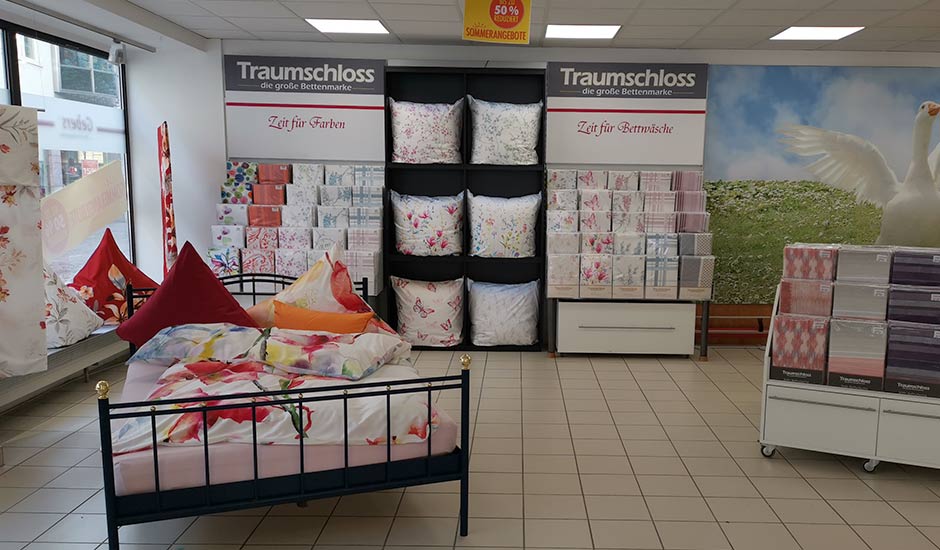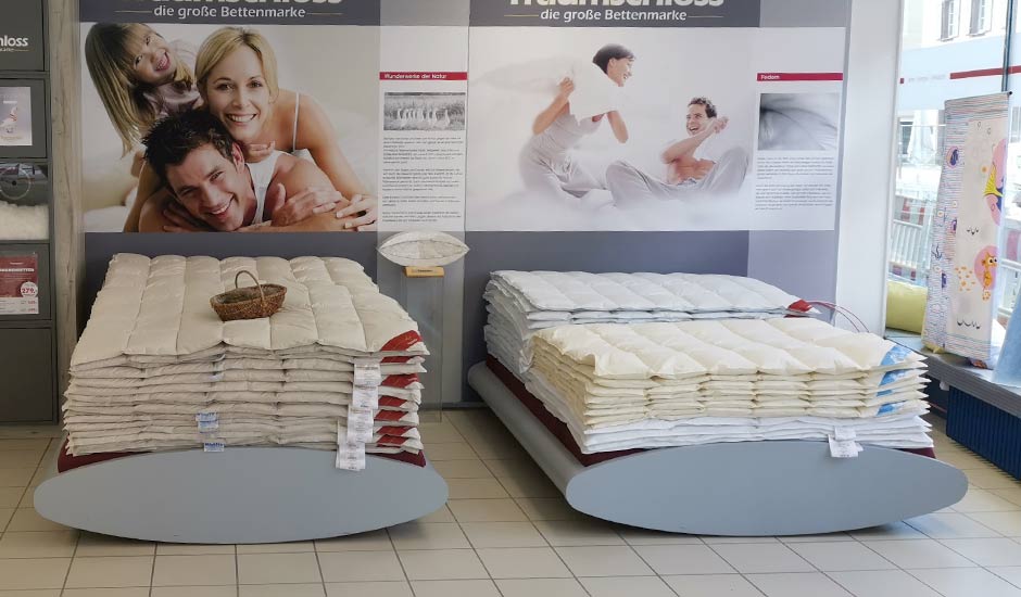 Besuchen Sie uns in Villingen: Hier finden Sie auf 450 qm im Erdgeschoss unsere Traumschloss-Matratzen, passende Bettdecken und Kopfkissen, Bettwäsche und Frottierwaren. In unserer Matratzenabteilung können Sie sich in Ruhe umsehen, eine Liegeprobe machen und die Qualitäten unser Traumschloss-Produkte auf Herz und Nieren prüfen. Unsere bestens ausgebildeten Gebers-Schlafexperten beraten Sie gern in puncto Aufbau, Material und ergonomisches Liegen nach den neuesten Erkenntnissen der Schlafforschung. Anhand einer Liegeanalyse können Ihnen unsere Mitarbeiter*innen das für Sie geeignete Schlafsystem empfehlen. Bei uns finden Sie darüber hinaus schicke Kissen und kuschelige Wohndecken, die nicht nur gemütlich warm halten, sondern auch noch gut in Ihre Wohnung passen. Sie haben die Wahl zwischen vielen modernen Dessins, verschiedenen Größen und unseren unterschiedlichen Qualitäten von Basic über Comfort zu Exclusiv und Premium. Wenn Sie ein Geschenk suchen, bietet Gebers Ihnen eine große Kollektion an Handtüchern und Bettwäsche in allen Größen und vielen Farben.